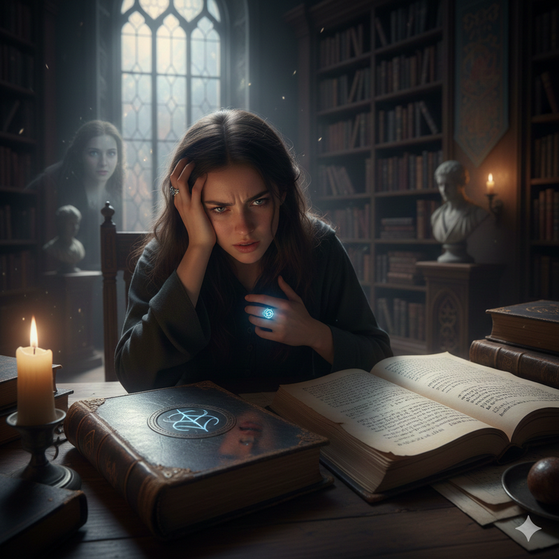 "Ніч після небезпечної пригоди була важкою. Лу не могла заснути. Всі образи з того, що сталося, не давали їй спокою. І кільце, яке лежало поруч, ледь не згоріло від напруги її думок. Вона знайшла сили піднятися з ліжка і підійти до столу, де лежав давній, вкритий пилом том. Лу знайшла його в одному з заборонених архівів Академії, той, що був повністю закритий для студентів. На обкладинці не було назви, лише символ, який Лу вже бачила: той самий, що викарбуваний на її кільці.