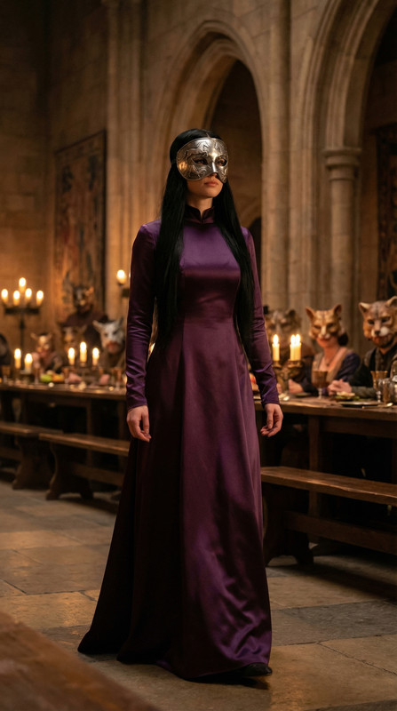 Дівчину з неймовірно довгим чорним волоссям, у пурпуровій сукні, що високо піднімалася до горла.