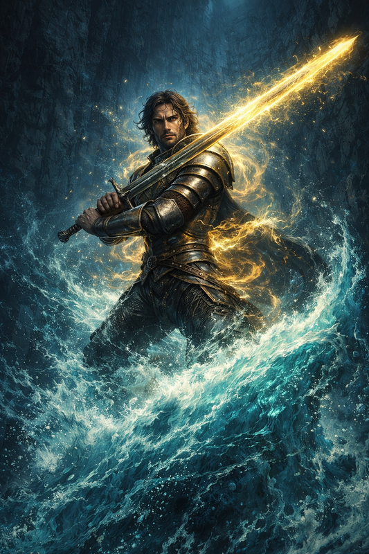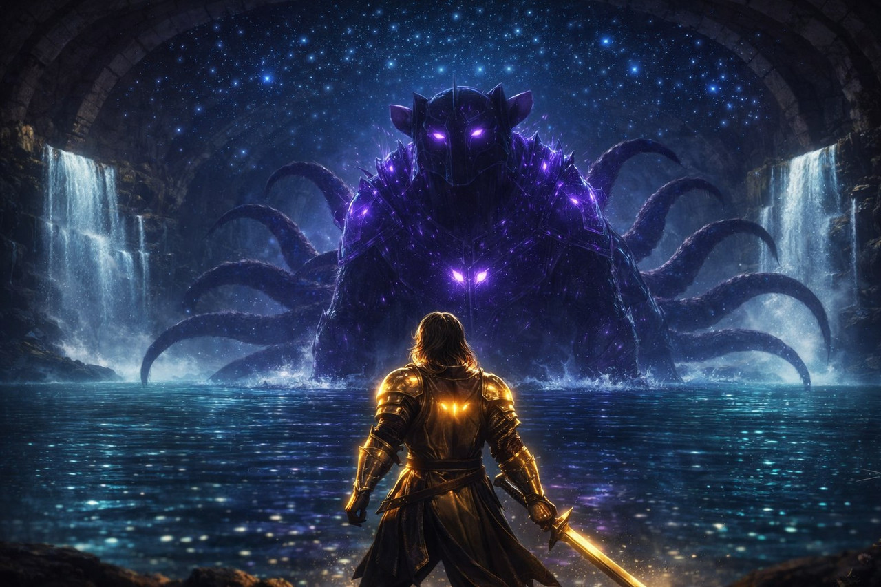 В центрі озера, просто біля мосту, вода раптово зійшлася докупи і з гуркотом рвонула вгору. Стовп води здійнявся на половину висоти печери, розсипаючи навколо бризки аквамарину.