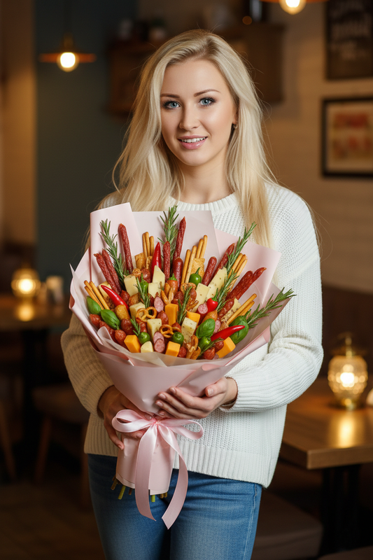 І підстава не змусила на себе довго чекати… Поки я знімала пальто, до столика підійшов той, кого я точно не очікувала тут побачити. Ян. З розгубленою усмішкою. І букетом з… ковбаси, сиру і перчиків чилі, загорнутий в ніжно-рожевий папір і зав’язаний такою ж ніжно-рожевою стрічкою. Я дивилась на нього, він дивився на мене і я розуміла, що це не просто збіг, а ретельно продуманий план. План звести мене з Яном.