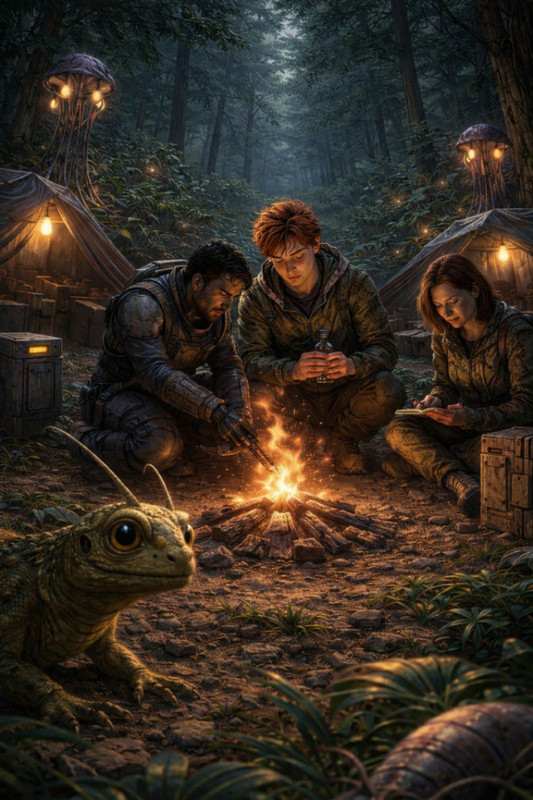 У хащах щось рухалось. Не одна істота, а багато, дуже багато. Темрява між стовбурами стала густішою. І тоді вони почули звук. Не кроки, не шурхіт а дихання - глибоке і повільне. Полум’я раптом здригнулось і різко пригнулось до землі, ніби хтось невидимий подув на нього згори. Дружок тихо заскиглив й притиснувся до ноги Лукаса. Ітан повільно підняв голову.