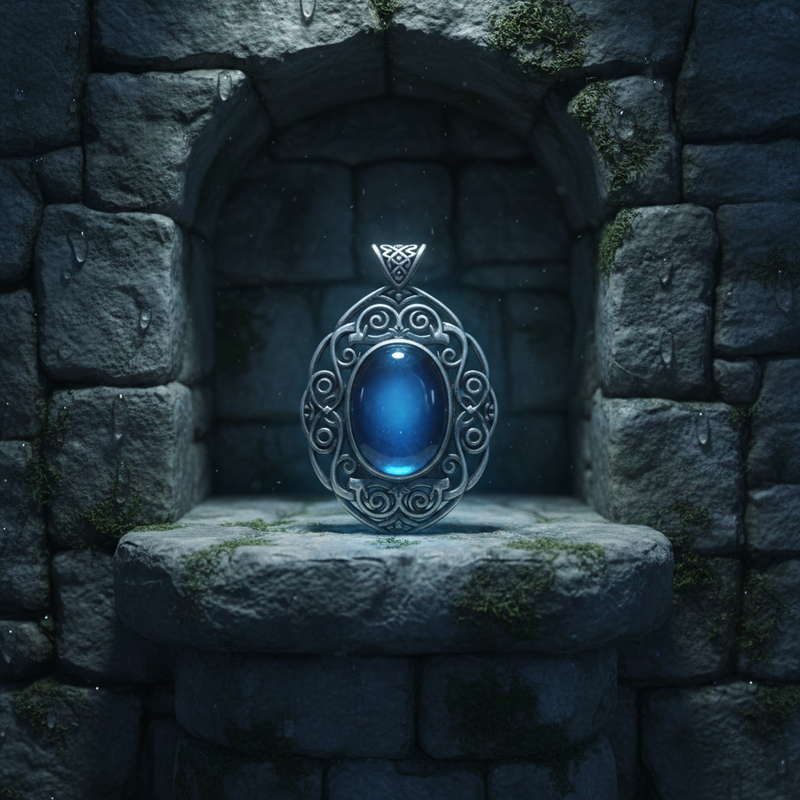 Кімната була маленька й майже порожня. У ніші навпроти стояв вирізьблений із каменю постамент. На ньому лежав амулет. Блакитний камінь у центрі світився м’яким холодним сяйвом, ніби дихав власним світлом.