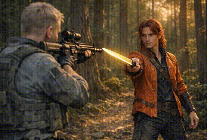 Техніку швидкого вихоплювання меча Кель свого часу опанував досконально. Мить – і сяючий рівним жовтим світлом клинок дивився в обличчя світловолосому чоловіку у сірому одязі та похідному спорядженні. Той, в свою чергу, тримав ельфа на прицілі якоїсь довгоствольної вогнепальної зброї.