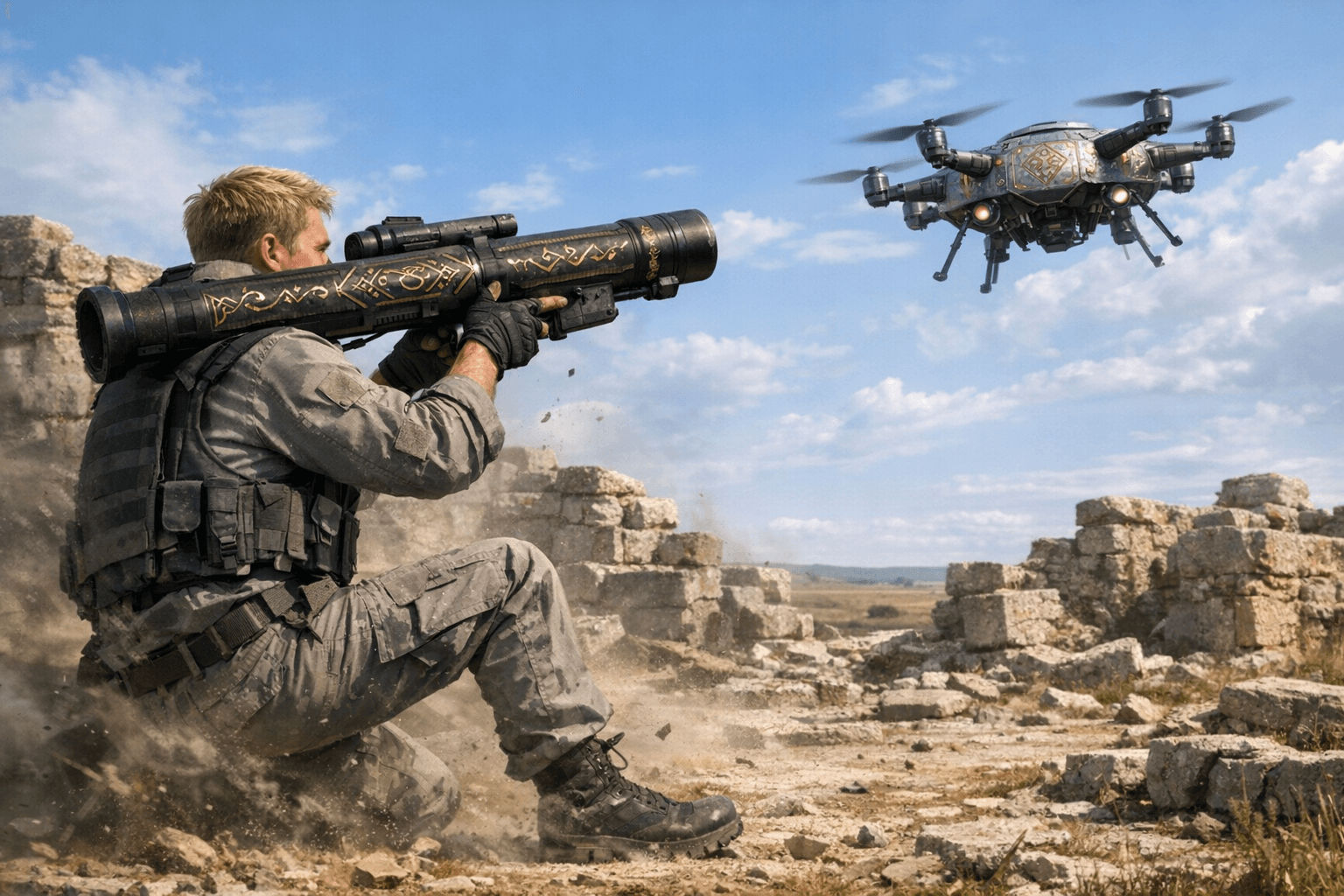 Вистрибнувши з-за стіни, найманець впав на коліно, прилаштував пристрій на плече, прицілився й натиснув на спуск. З виттям та свистом, залишаючи за собою полум’яний хвіст, довгастий металевий снаряд за секунду подолав відстань до дрономатки.