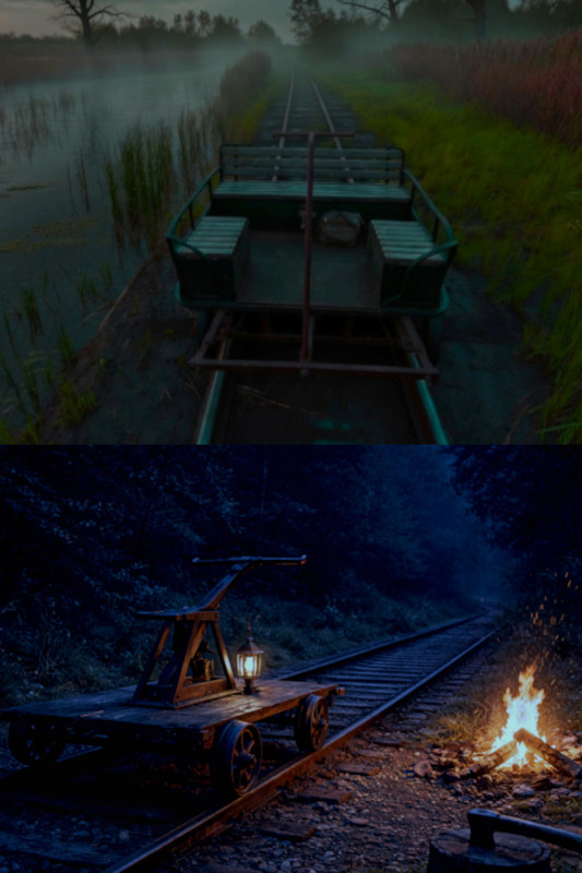 Але коли він пройшов через кущі, то знайшов раптом якийсь насип. По землі, в обидва боки, на скільки вистало погляду, тягнулися якісь металеві бруски. Що то таке і навіщо воно — Айвор не знав. Під металевими брусками, мабуть щоб зміцнити конструкцію, були вже дерев'яні бруски. Усі вони були вологими й зеленими, але то було не дивно — болото все ж таки... Але от те, що здивувало чоловіка — так це те, що на металевих брусках стояли якісь дві лави, що були з'єднані між собою спільною підлогою. По центру, між лавами, був якийсь металевий важіль, що вже весь заріс мхом та чимось ще. І уся ця конструкція трималася на чотирьох колесах.