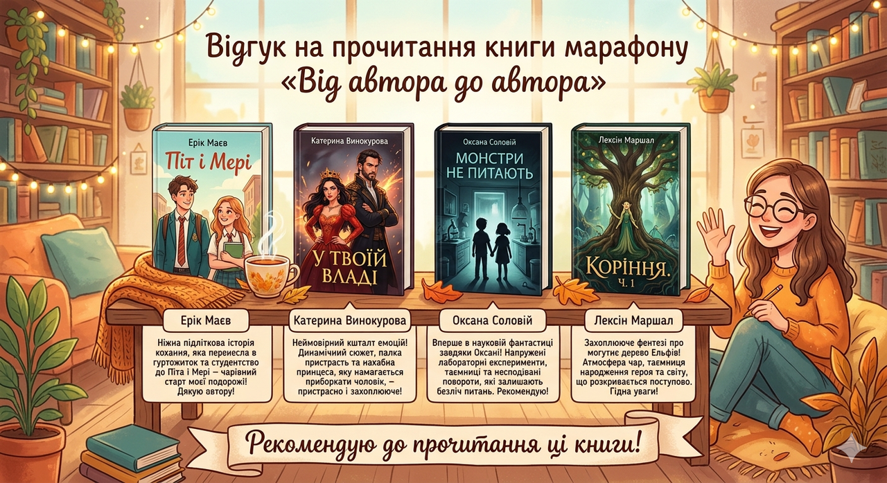 Ну і 4 книга, мабуть одразу виникнуть питання чому? Це моя штрафна санкція собі, за те, що доставила автору Лексін Маршал деякі незручності ( впустила ще двох авторів , які ну дуже попросилися на марафон, а я як розумієте, не могла відмовити...Тому ех.... список трохи зʼїхав вниз, а автор вже погрузився в привабливу атмосферу читання, не підозрюючи, про силу Магії побігших рядків.... (та й таке...) Саме тому, прочитала на 1 твір більше, ніж треба було ( Дякую Шепіт Місяця і Олена Ранцева, герої які влетіли зі свистом вітру в останній «від'їжджаючий вагон... підтримали мене і відповідно теж прочтуть цю книгу, як бонус для …Лексін Маршал