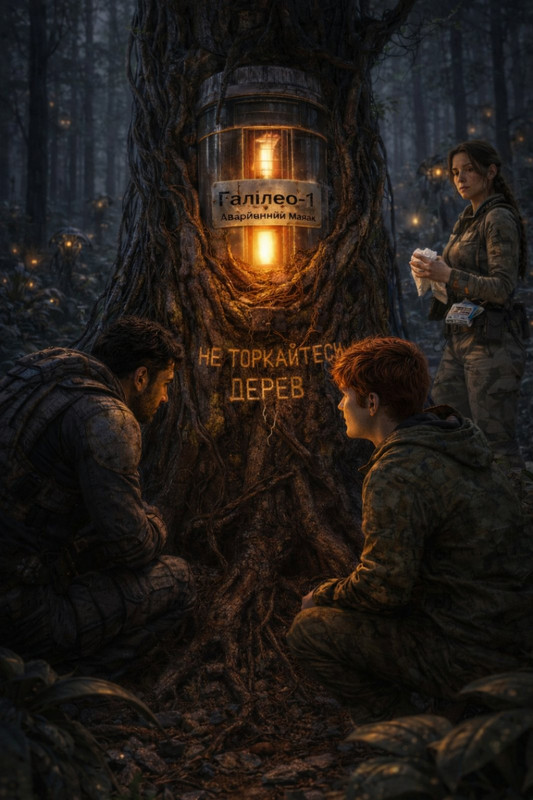 " Посеред невеликої галявини стояло дерево. Високе, старе і товсте, як вежа, а з його стовбура стирчав металевий циліндр. Це і був маяк - аварійний передавач попередньої експедиції. Він був майже повністю втягнутий у дерево. Кора обхоплювала його з усіх боків, ніби рослина намагалася повільно проковтнути метал. Гілки обвивали антену, а коріння піднялося над землею і затиснуло основу пристрою, як пальці. Маяк все ще блимав – тихо, слабко, ніби серце, що б’ється останніми ударами.