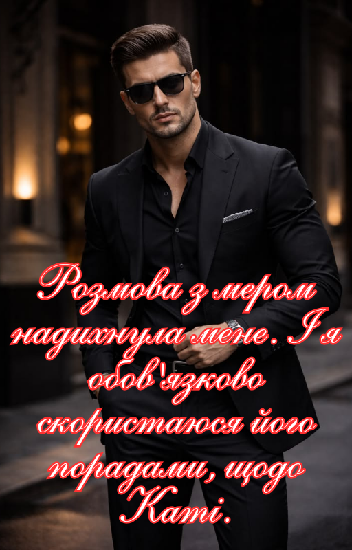 — От і прекрасно. — вдоволено посміхається мер. — Ти ж мужчина, то ж, може, не потрібно тиснути, а навпаки. Завершиш справу з розлученням — і можна позалицятися до Катерини, а не тиснути. Жінки ж люблять квіти та знаки уваги, навіть тоді, коли ображені. Повір мені, Андрію, я знаю, що кажу. І це куди дієвіше від тиску чи наполегливості.