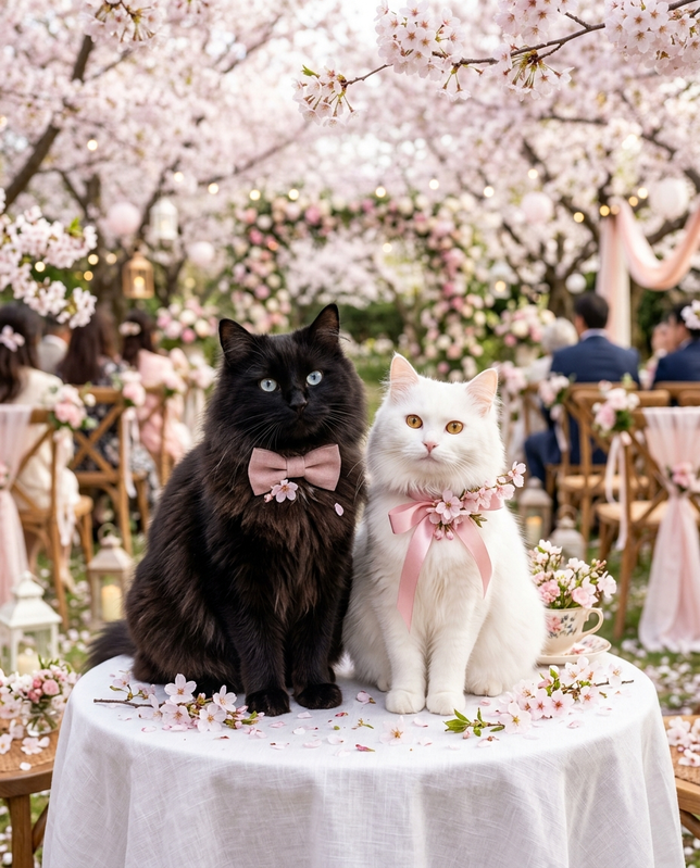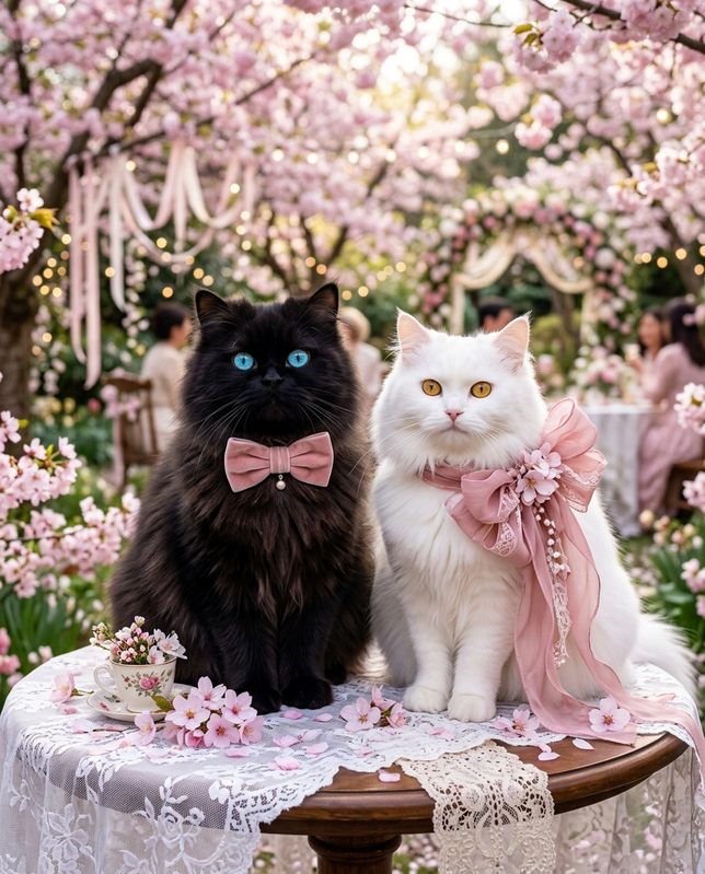 Наших котиків ми теж прикрасили — Феліксу ми пов’язали на шию рожеву краватку-метелик з оксамиту, а Феліцію прикрасили величезним шифоновим бантом з квітами сакури. І вони навіть не були проти. Чесно-чесно! Жодної магії.