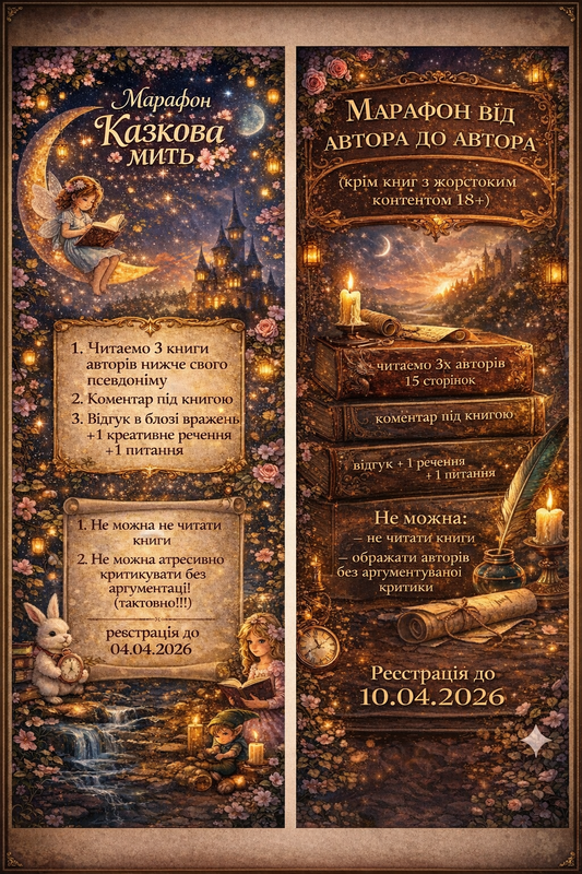 Прийом заявок Сугубо до встановленої дати і часу ( кількість учасників не обмежена, всі хто бажає, але встиг ), після двері закриваються на замок і ключ вибрасується. Вибачайте, але часу на реєстрацію достатньо!! А мені ще буде треба готувати списки охочих.. Старт марафону «Казкова мить» 04.04.2026 кінець 18.04.2026 , а Марафон від Автора до автора з 11.04.2026 до 25.04.2026