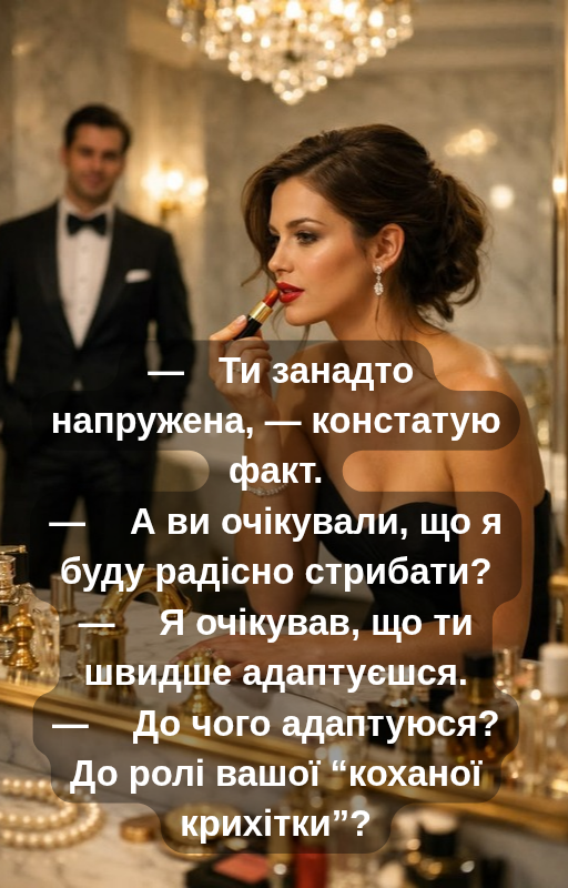 — Даміре Ернестовичу, якщо ви розраховуєте, що я висітиму на вас весь вечір, то можу вас запевнити цього не буде. Я не дуже знайома з правилами етикету, але робити те, що мені неприємно, не погоджуся нізащо. Тому попрошу це врахувати.