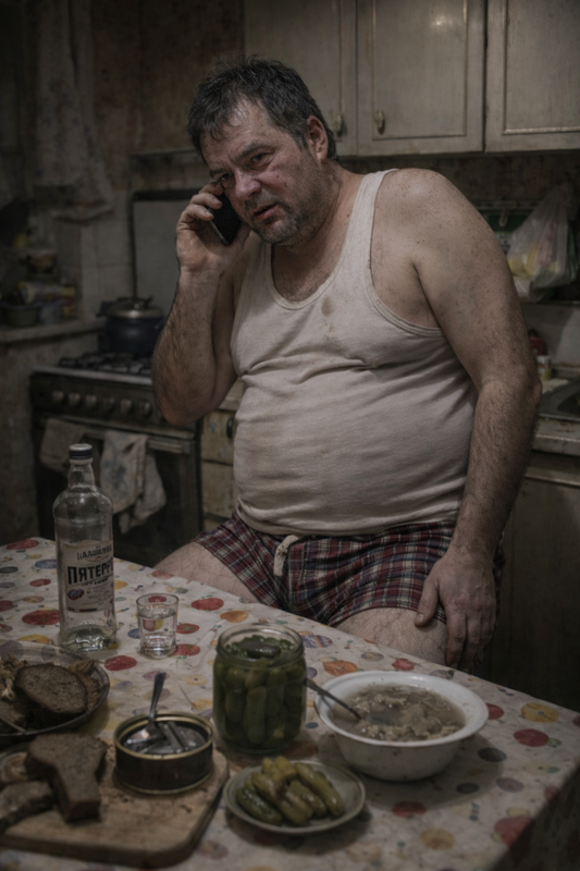 Із розпатланим волоссям і червоним обличчям, вкритим чорною із сивиною щетиною, одягнений у сімейні труси у клітинку та білу майку не першої свіжості, з під-яких виглядали добряче-волохаті пахви, руки та ноги, він був персонажем майже точно списаним із мужика з Таганрогу з відомої гумористичної передачі “Наша Раша”. Образ доповнював забацаний стіл зі скатертиною у горошок, натюрморт на якому складався із початої чекушки горілки, гранчака, жерстяної банки зі шпротами, половинки чорного хлібу, малосольних огірків у скляній банці, а також залишків холодцю у білій керамічній мисці.