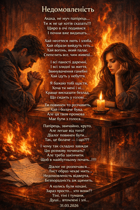 УвійтиТак закінчення стосунків це справді боляче! Та не зовсім все може йти так,як би ми цього хотіли! Дуже гарно написано,зразу видно що саме ця тема відчувається глибоко! Вразили слова❤️❤️❤️