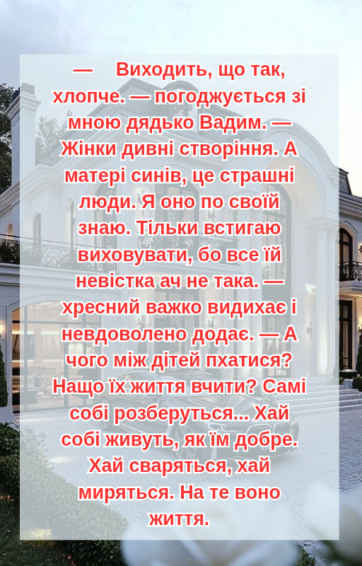 Хресний йде спати, а я не можу. Бо після всього почутого більше ні про що думати, як про Катерину та її сина. Думка, що це моя дитина, не полишає мене. Розумію, що можу себе накручувати, але тим не менше. Я хочу все дізнатися. І якщо Марко та Катя мовчать, то я все одно все дізнаюся. Зрештою, якщо це мій син, то все можна порахувати. І якщо це правда, то я нізащо не допущу, аби мій син жив без батька. І тоді мене не зупинить ніхто.