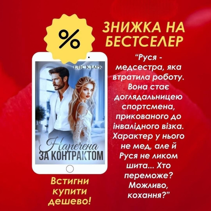 Запрошую до завершеної історії з топу Букнет "Наречена за контрактом", яка точно не залишить вас байдужими! Тут є протистояння характерів та кохання, яке зцілює... Тільки сьогодні до півночі ви можете придбати цю книгу зі знижкою!