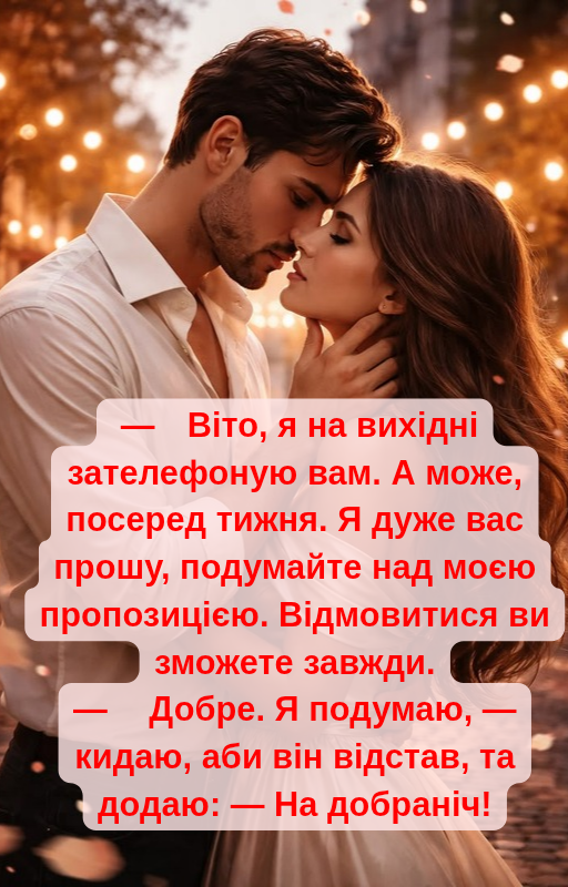 — Віто, ви вибачте. Але й постарайтеся зрозуміти мене. Після вчора мені важко довіряти людям. Адже я довіряю найцінніше та найдорожче, що у мене є.