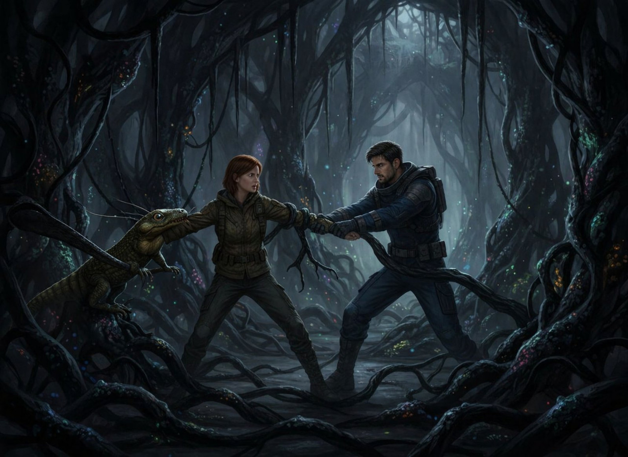 Ліани різко рвонули вперед і схопили Анну за руку. Дружок встиг стрибнути між ними і вчепився за рукав Анни, тягнучи її в інший бік."
