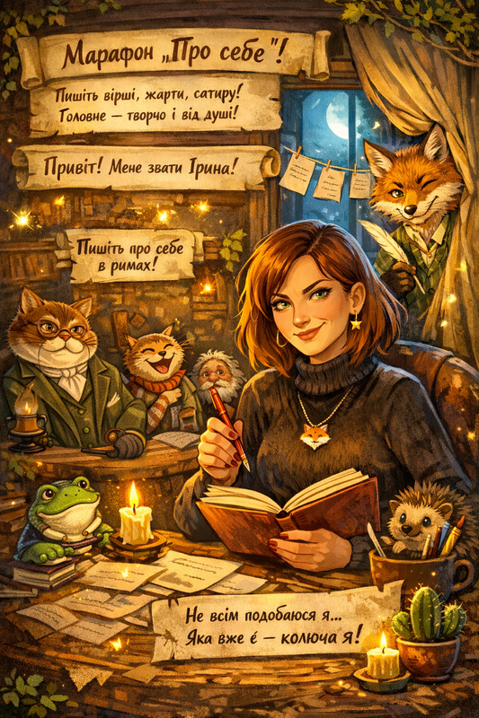 Ітак, марафон «Про себе». Пишіть вірші про себе, можете додавати жарти, сатиру — хто що забажає! Головне — творчо і від душі. Усіх охочих запрошую, бо, як показує практика, ті, хто раніше вважав, що не вміє, пишуть прекрасно.