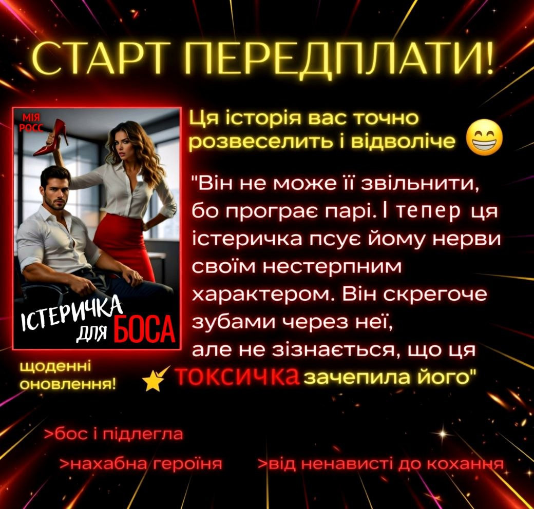 Істеричка для боса , тож прошу підтримати мене саме у перший день передплати, це дуже важливо для автора!❤️
