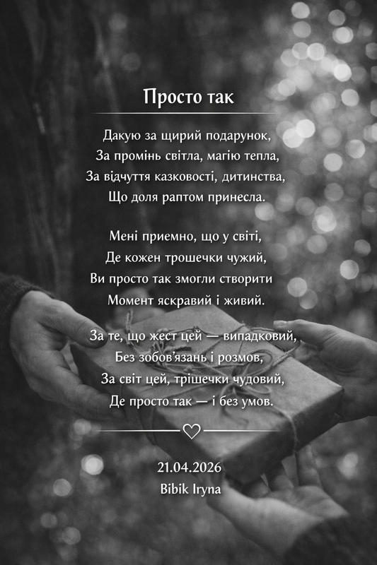 Це була збірка моїх творів. Уявляєте? Людина, яка мене зовсім не знає, захотіла зробити приємне — щиро і просто так, від серця.