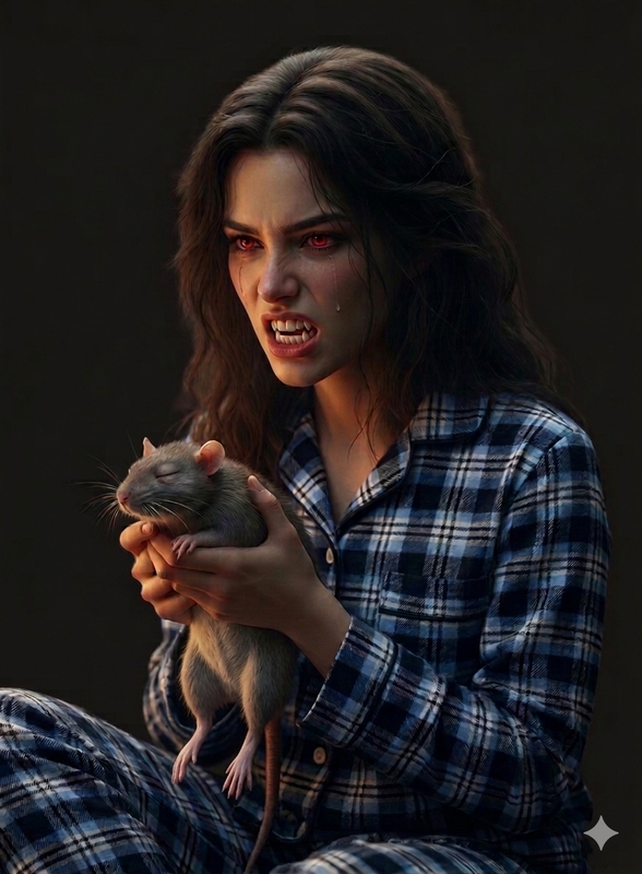 Відчинивши двері, він побачив вампірку за обідом. Та тримала тільце вже обм’яклого щура й жадібно впивалася в нього іклами. Він удав, що нічого не помітив. Дістав склянку, набрав води, випив і повернувся спати. «Ранок буде ніяковим», — подумала Рая, запаковуючи тільце щура в смітник.