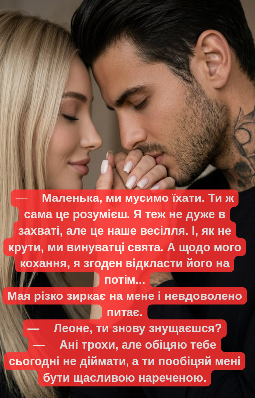 — Має, годі сарказму. — трохи голосніше прошу. — Насправді я вдячний тобі за все. За те, що погодилася на мою спонтанну та таку божевільну пропозицію. Зрештою, ти не тільки грала роль, ти була справжньою нареченою, за що я щиро дякую тобі. І хочу висловити окрему подяку за розмову з Кларенс... — а далі розповідаю своїй дружині про візит моєї колишньої до моїх батьків.