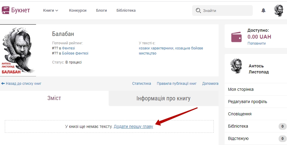 Для додавання тексту скористайтеся кнопкою "Додати частину". Найкраще завантажувати свої твори на Букнет з програми Word, де текст розбитий на абзаци стандартним методом (тобто натисканням на клавішу Enter). У цьому випадку Букнет найбільш коректно конвертує текст для читання.