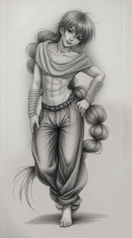 Довге чорне волосся, як у дівчини, було заплетене в товсту косу. Позолочені наручі, коричнево-червоні султанки і тон їм топ. Ну, загалом, цей наряд нагадував водночас стандартний одяг артистів крайнього сходу і щось віддалено схоже на народний костюм індусів. Вічно бліда з хворобливо-сіруватим відтінком шкіра і коричнево-червоні очі наділяють непереборним бажанням віднести це «диво природи» до загону нежиті. А все це разом із поганим характером дає хлопцеві схожість на невихованого вампіра-підлітка.