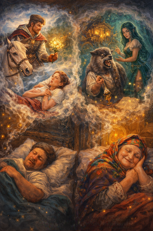 Тим часом у сусідньому дворі Степан видав таку руладу хропінням, що аж переляканий півень у курнику з жердини впав. Йому снилося, що він веде Оксану під вінець, а вона раптом повертається — і замість усмішки в неї вовча паща, а з-під плахти хвіст кудлатий виглядає. І тільки вона пащу роззявила, щоб «так» сказати, як з-за іконостасу вискакує мавка — ноги довгі, очі зелені, і манить його пальцем у ліс, обіцяючи бричку з золотими осями.