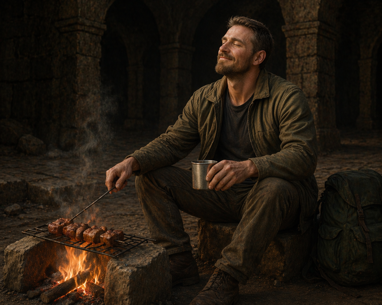 Розстилаю брезент ближче до вогню, кидаю на нього куртку. Знімаю панаму, тру обличчя, на щоках шар пилу змішується з потом. Руки тремтять від утоми, але в цьому тремтінні вже немає страху, лише виснаження. Ставлю решітку на два камені, розкладаю м’ясо. Коли жир зашипів, повітря наповнюється запахом, від якого зводить щелепи. Дим і м’ясний сік змішуються у солоний, терпкий аромат, що щільно лягає в повітрі, аж слина підкочується до язика. Шлунок бурчить у відповідь, коротко, живо, майже радісно. Полум’я лиже шматки, на поверхні повільно з’являється золотава скоринка. Стежу, як м’ясо темніє, як виступає сік, як повітря колише запах, жирний, димний, теплий. Цей запах схожий на спогад про життя, що лишилось десь нагорі, але зараз він стає єдиним доказом, що світ іще існує.