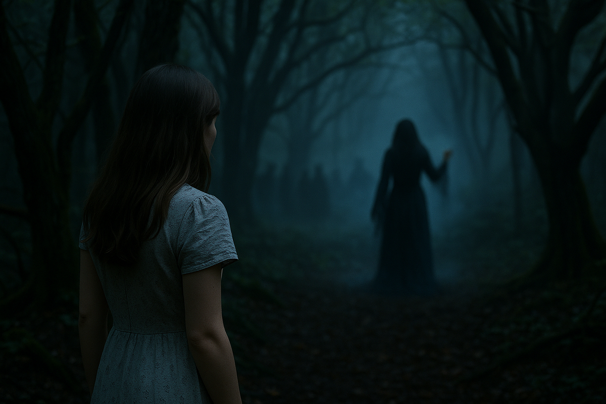 У центрі галявини стояла жінка. Її довге темне волосся спадало майже до землі, а очі віддзеркалювали слабке місячне світло, роблячи її погляд нереальним. Вона стояла нерухомо, ніби сама була частиною цього лісу.