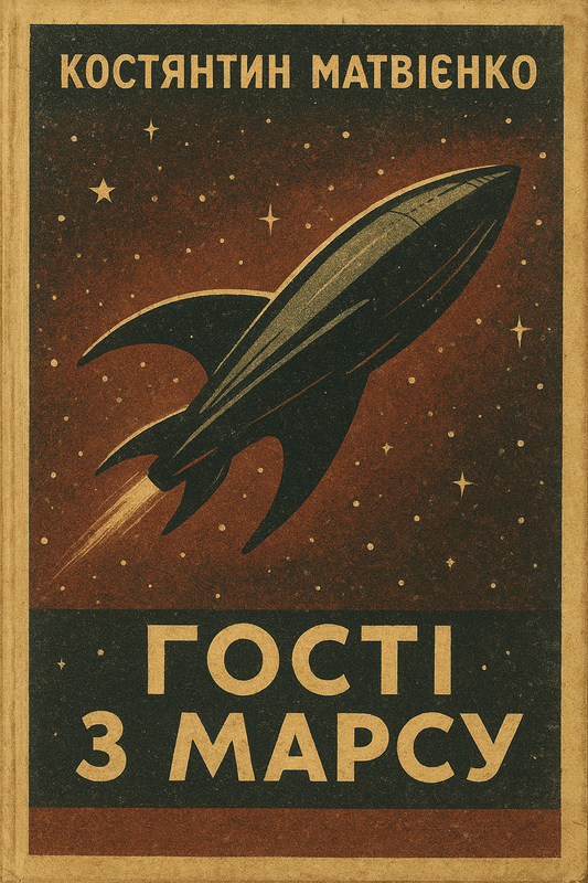 На палітурці — трохи потьмянілий малюнок: зоряне небо, і серед нього силует корабля, схожого на рибу з крилами. Напис: Костянтин Матвієнко. «Гості з Марсу». Науково—фантастична повість.