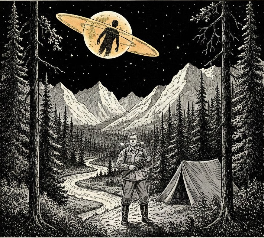 Я ступив кілька кроків — і раптом помітив, немовби місяць розпався, від нього відколовся блискучий жовтий прозорий диск, і я навіть угледів там постать усередині нього. Далі сталося щось дивовижне: місяць лишився на своєму місці, а блискуча жовто—помаранчева куля (вона немовби міняла колір) почала повільно знижуватися над лісом. У ній виразно сиділо невідоме створіння.