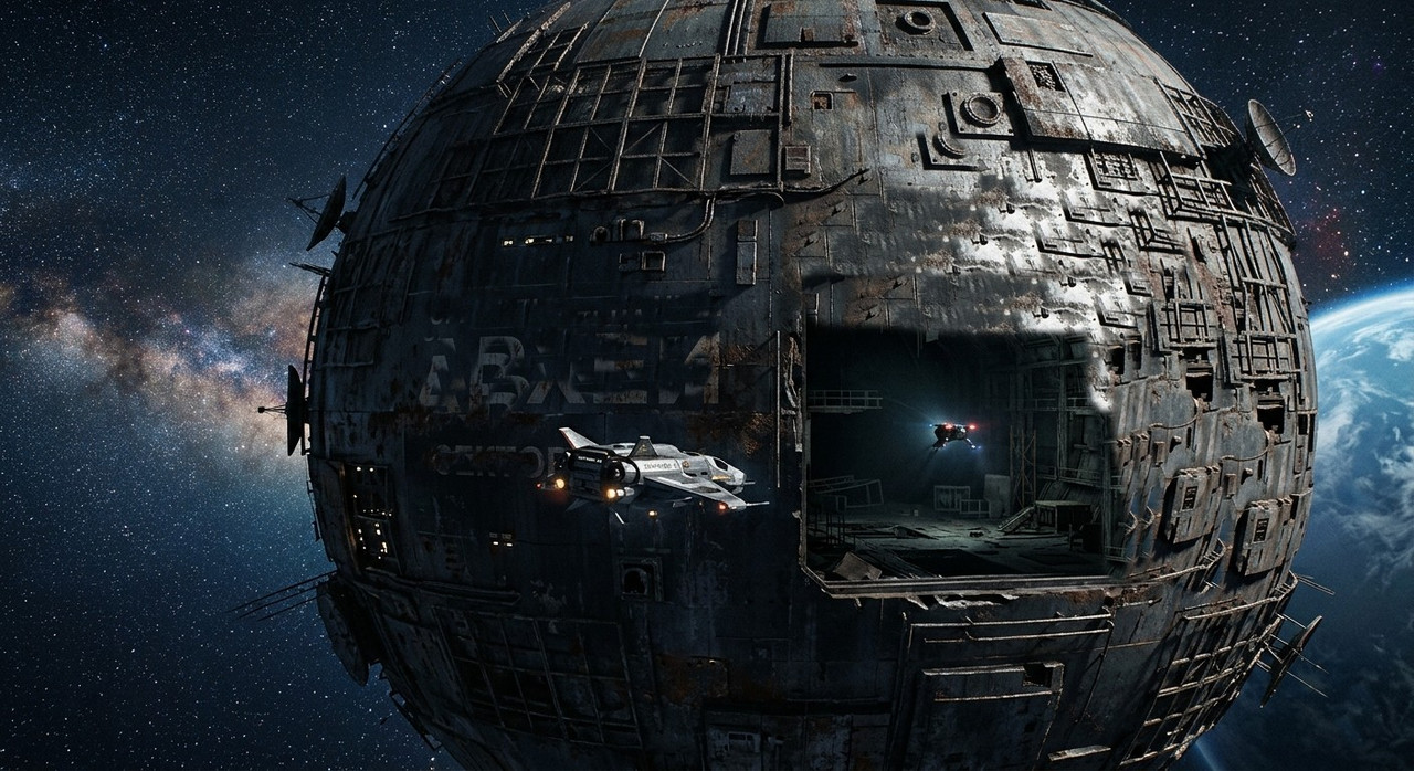 І ми вирушили в напрямку цього грандіозного об’єкту; це дійсно була космічна станція, але трохи незвичайної форми. Це була величезна металева куля. Такі космічні станції перестали будувати ще багато сотень років тому. Нам здалося, що це мертва станція, тим паче що з нашої сторони був відкритий шлюз порожнього ангару. Вирішивши не поспішати, ми зупинились перед шлюзом. Один з розвідників залетів в ангар та й передав нам зображення того ангару. Він був абсолютно пустий.