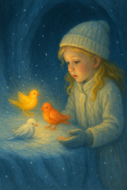 Його рука з темряви торкнулася повітря, і в центрі печери крига зрушилася, відкривши прозору галявину. На ній сиділи маленькі створіння зі снігу, схожі на пташок. Вони світилися кожна по-своєму: одна — помаранчево, інша — золотаво, третя — майже не світилася зовсім. Вона лежала осторонь, з обірваним крильцем, і здавалося, ось-ось розтане.