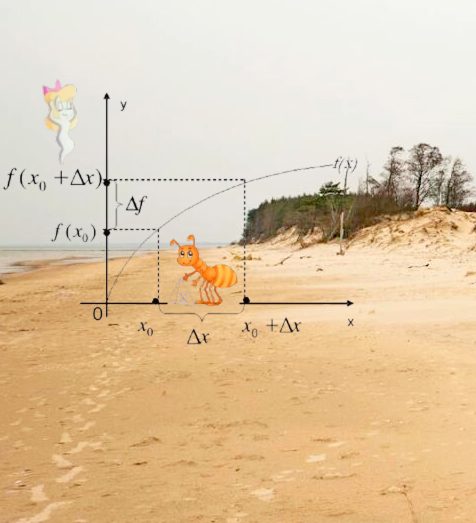 - Точно, до прикладу. В теорії використано граничний перехід, коли кінцевий відрізок на числовій осі стягується в нуль і це призводить до взяття похідної від функції. От, уяви собі мураху, що наче на біговій доріжці, — перебирає лапками кожне число, бажаючи дістатись до нуля.