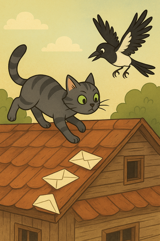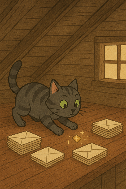 Кіт Мурчик обережно ступав по даху старого будинку. Дах рипів і трішки похитувався, але котик був сміливий. Кіт послизнувся у дірку між черепицями над будинку. І що ж він там побачив? Це були листи! Вони лежали купкою, наче сховалися від усього світу.