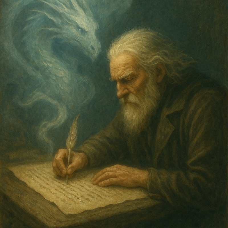 Старий літописець сидів біля холодного каменю, тримаючи в руках перо, яке не хотіло писати. Факел поруч ледве жеврів, немов намагаючись не порушити спокою. Повітря було наповнене чимось неспокійним — невидимим напівзвуком, схожим на далекі удари серця світу.