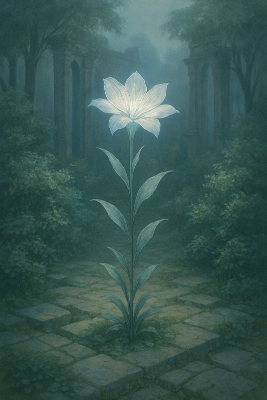 Пройшовши вузькою вуличкою, що спускалася до центральної площі з кам’яною бруківкою, вони помітили дещо дивне. Просто посеред розбитих плит, між тріщинами й мохом, стояла самотня квітка. Її високий стебло виблискувало сріблястим відтінком, а пелюстки мерехтіли, мов хмаринки, пронизані променями ранкового сонця.