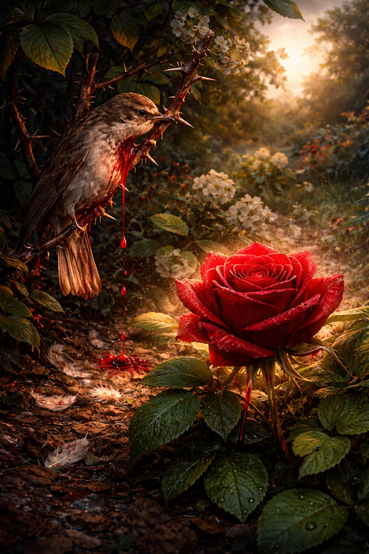 Місяць на небі застиг, як шматок білого сиру, а Соловейко вже не співав — він сповідався. Кожна шпичка, що входила в його маленьке серце, була як татарська стріла. Але він не здригнувся.Він виспівував усю тугу за несправдженим коханням усіх спудеїв світу, увесь вогонь, що горить у серці козака перед боєм. Його кров не просто текла — вона стікала, як свячений мак. Квітка пила ту кров, як козак оковиту після походу — жадібно і до останньої краплі. І коли остання нота, висока й чиста, як дівоча сльоза, полетіла над ставом, Соловейко впав у полин, затихнувши навіки. Він зник не як жертва обставин, а як герой, що віддав життя за те, щоб цей світ хоч на один ранок став красивішим…