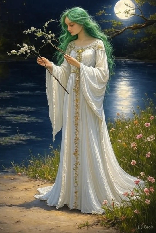 На ту, хто була для лісу піснею, світлом і тишею водночас. Її довге зелене волосся спадало на плечі водоспадом, у ньому цвіли анемони й лісові дзвіночки, а очі - глибокі, мов гірські озера - світилися тією самою весною, що й земля під її босими ногами. Вона не йшла - вона пливла між деревами, ніби сама частина вітру.
