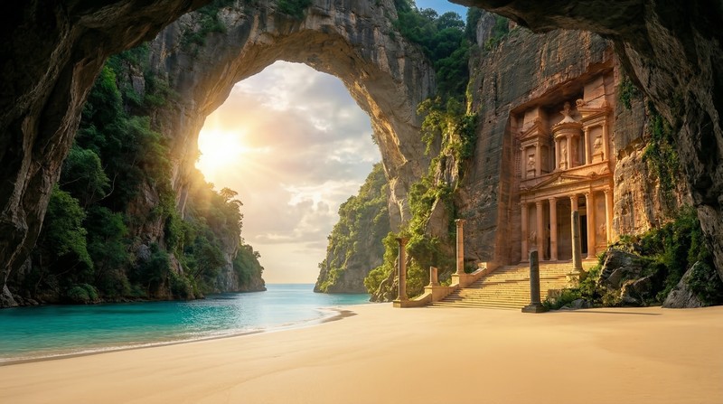Крізь колосальну природну арку в скелі лилося м’яке золотаве світло. Воно відкривало вид на безкрає блакитне небо та легкі хмари. Внизу, між стрімкими кам’яними стінами, розлилася спокійна бірюзова затока. А прямо біля води заховався невеликий, але чудовий пляж із золотим піском.