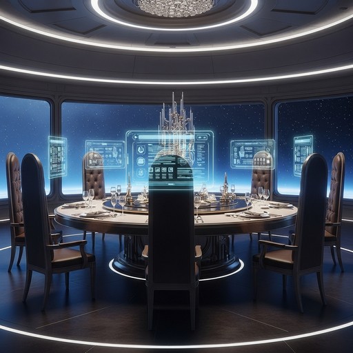 Підійшовши ближче, я почув, як вони спілкуються зовсім незрозумілою мовою; моя нейромережа визначила, що це мертва мова стародавньої імперії. Потім на моїх очах стіл змінив свою форму, став круглим, сервірування змінилося згідно з кількістю присутніх людей.