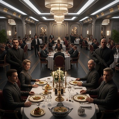 Перед кожним місцем з’явилися голографічні планшети, і от всі ці гості повсідалися на свої місця та й почали вивчати ті планшети, а мені прийшов сигнал, щоб я терміново з’явився на кухні. Передчуття підказало, що щось відбувається незвичайне, і воно мене не підвело. Кухню я не впізнав. Кухонний простір збільшився вдвічі, поряд із нашою звичайною кухнею через скляну стіну ми побачили ще одну кухню, яка була в рази досконалішою від нашої. На скляній стіні світився напис «Обслуговування імператора». І на тому боці працювали самі лиш дроїди. Ось одна таця наповнилася різними фруктами, друга — напоями. Схоже, що ті таці були антигравітаційні, бо дроїди-офіціанти їх швидко переміщали до того столу. На скляній стіні кухні я побачив голографічні проєкції семи планшетів, на яких було видно меню та відмітки про замовлення. І це все працювало автономно; незалежно від нашого ресторану, продукти були з їхніх сховищ. Трохи подумавши, я вирішив, що про це все необхідно повідомити господаря цього ресторану, нехай сам дає лад цим подіям. Розповів йому все: і про нахабних гостей, і про імператорське обслуговування. Вислухавши мене уважно, він відповів, щоб чекав, він зараз прибуде.