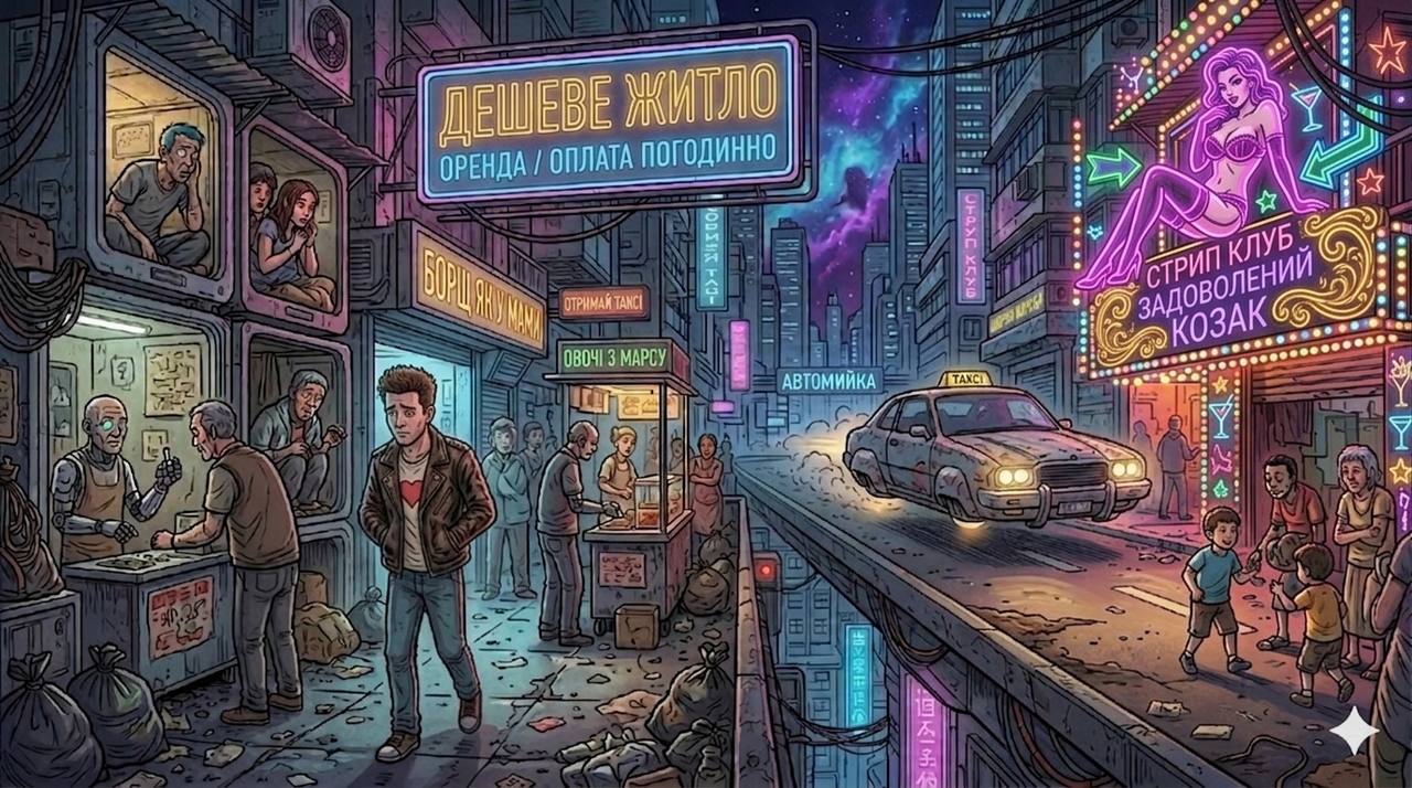 Місто жило своїм життям: цілодобово палали величезні неонові вивіски, магістралями з шаленою швидкістю проносилися літаючі машини, а тисячі людей кудись поспішали. Улюблена куртка Ромки була без капюшона, тому він втягнув шию в комір, тому що дрібний дощ неприємно лоскотав по шиї. Після чого хлопець пірнув у похмурий провулок, що вів до наступного житлового кварталу.