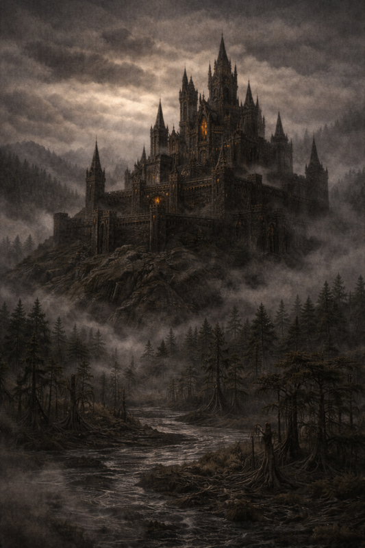 Академія Бронзових Драконів з’являється з туману як щось із чужого, правильного світу. Світу, де мені немає місця. З висоти це не місто й не звичайна фортеця — це темний замок-механізм, що вчепився у вершину кам’яного пагорба. Витягнуті вежі, мов стріли, впинаються в небо, гострі дахи, вузькі прорізи вікон-бійниць, вивірені до каменю внутрішні двори. Камінь майже чорний, сирий, місцями блищить вологою; бронзові накладки на стінах і балконах відливають тьмяним золотом навіть у цьому сірому ранку. Внизу під Академією тягнеться болотистий кипарисовий ліс — темне клаптикове море стовбурів, коріння й туману. Довкола немає ні міст, ні поселень — тільки болото, дерева і ця кам’яна громада, що стирчить над усім, як єдине правило посеред хаосу.