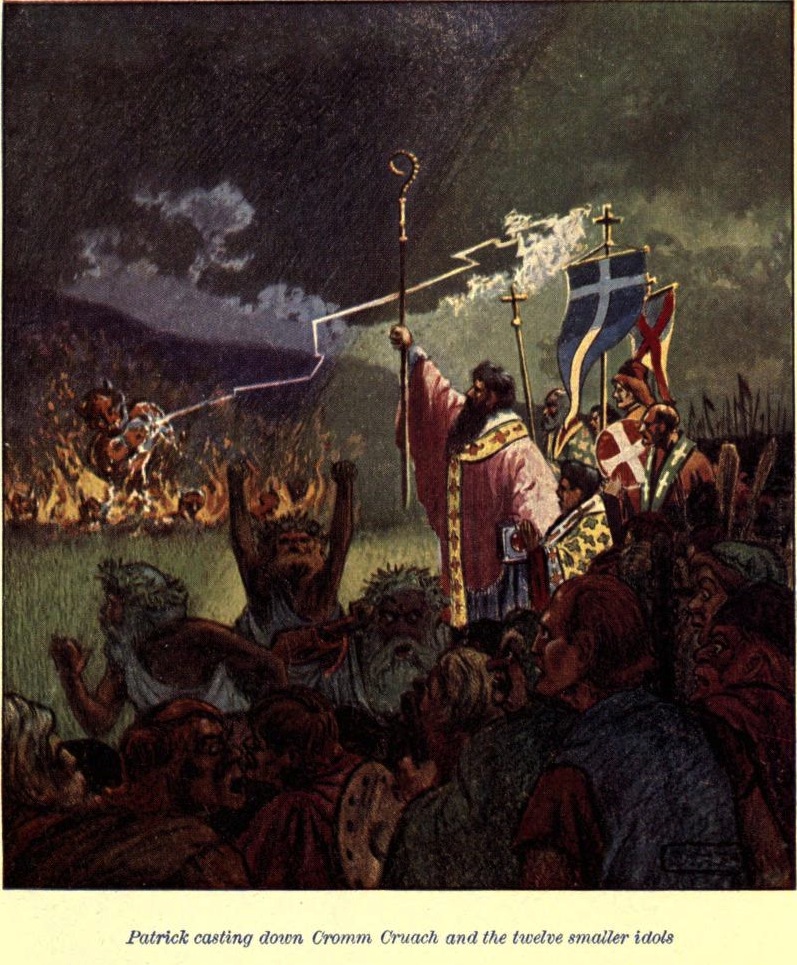 Але перекресленим сонцем Патрік не обмежився. Наступним його подвигом стало поверження богів друїдів. Майбутній святий прийшов на галявину, де жерці поклонялися золотому Кром Круаху і дванадцяти меншим кам'яним ідолам. В ту мить, коли друїди поклали перед своїми божествами дари, Патрік торкнувся Кром Круаха єпископським посохом... і в ту ж мить ідоли розсипалися на друзки.