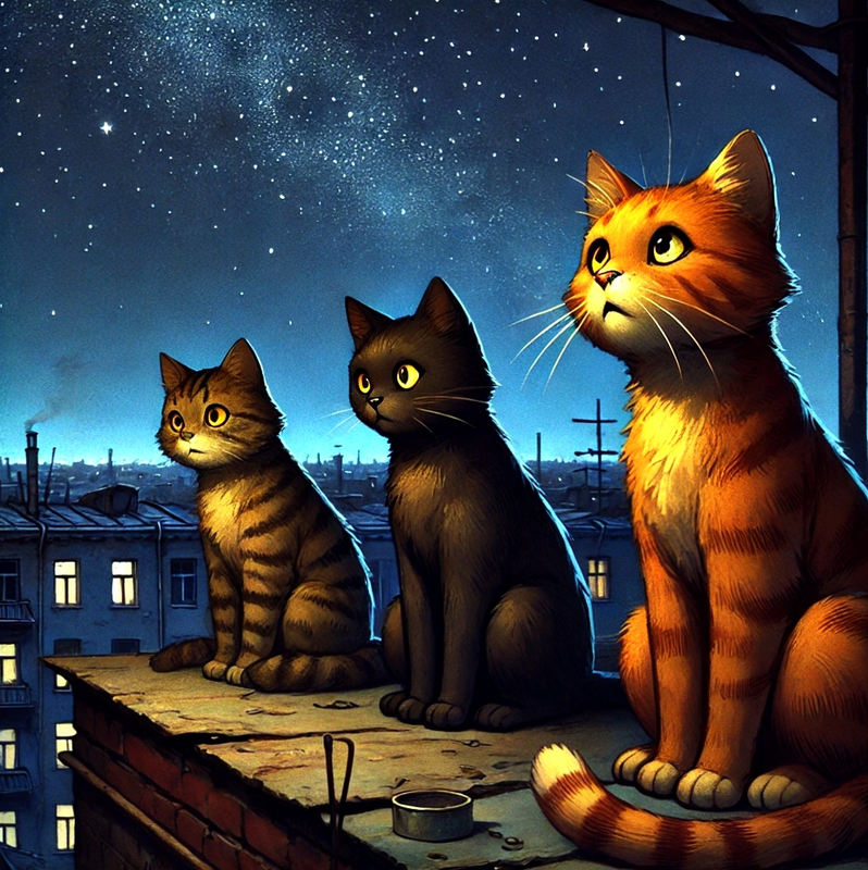 Попереду йшов великий смугастий кіт з обгризеним лівим вухом та високо піднятим хвостом. За ним – семеро волоцюг. Але найбільше увагу Рудого привернула кішка, що йшла позаду зграї. Біла довга шерсть різко відрізняла її від сірої маси інших котів. Вона, як і сам Рудий, була перської породи.