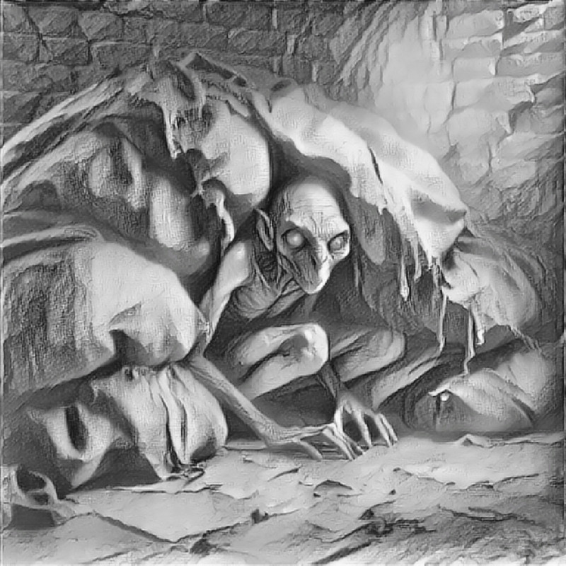 Зморщивши вузький, схожий на дзьоб ніс, істота застережливо зашипіла. Її великий, розтягнутий рот відтулився, оголивши затуплені, клиноподібні зуби. Бліда, лляного кольору, шкіра надавала істоті мерзенної подібності на ходячий труп.