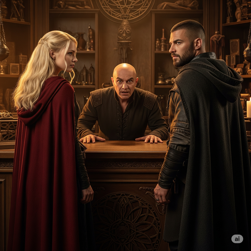 В середині магазин був... моторошно казковий. На полицях — амулети, коробочки, дзеркала, кулони, склянки з дивними рідинами. Все блищало, мерехтіло й гуділо на рівні чуттів. Приміщення тісне, наповнене запахом сухих трав, старого паперу та ще чогось... важкого. Майже як тлін.